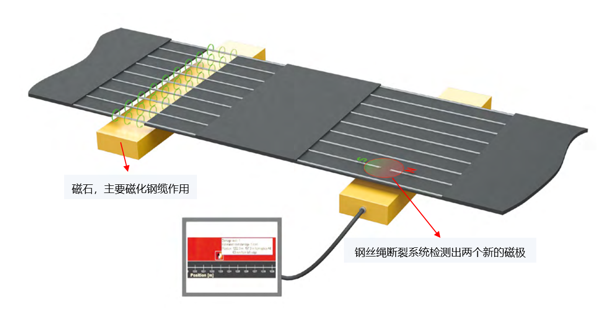 皮帶健康監(jiān)測(cè)系統(tǒng)基于霍爾傳感器原理,能夠準(zhǔn)確探測(cè)輸送帶內(nèi)鋼芯的斷點(diǎn)位置,在實(shí)際運(yùn)行環(huán)境和工作條件,如果鋼纜上的任何?點(diǎn)發(fā)生損壞(例如切割),就會(huì)產(chǎn)生兩個(gè)新的磁極,并且立即可見。